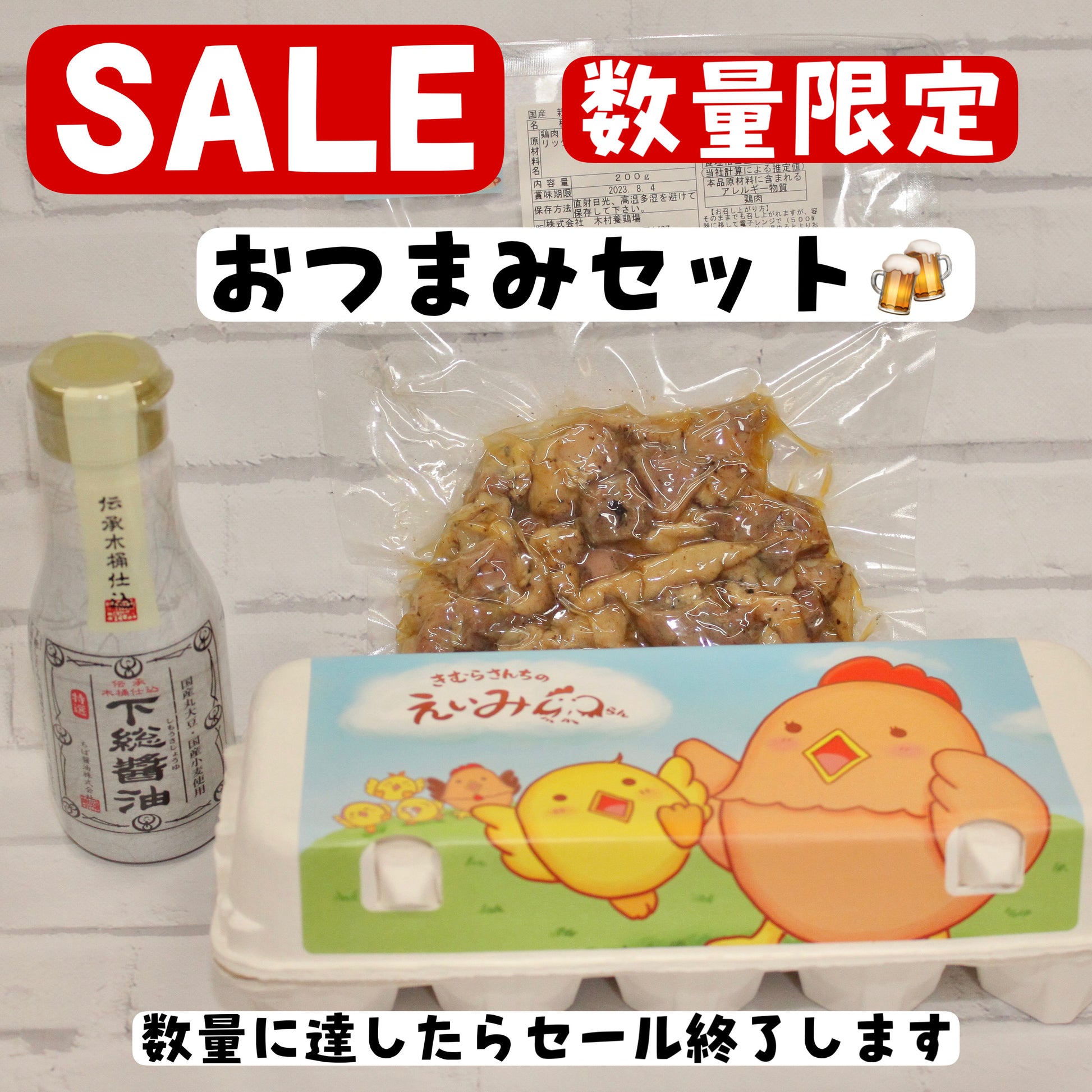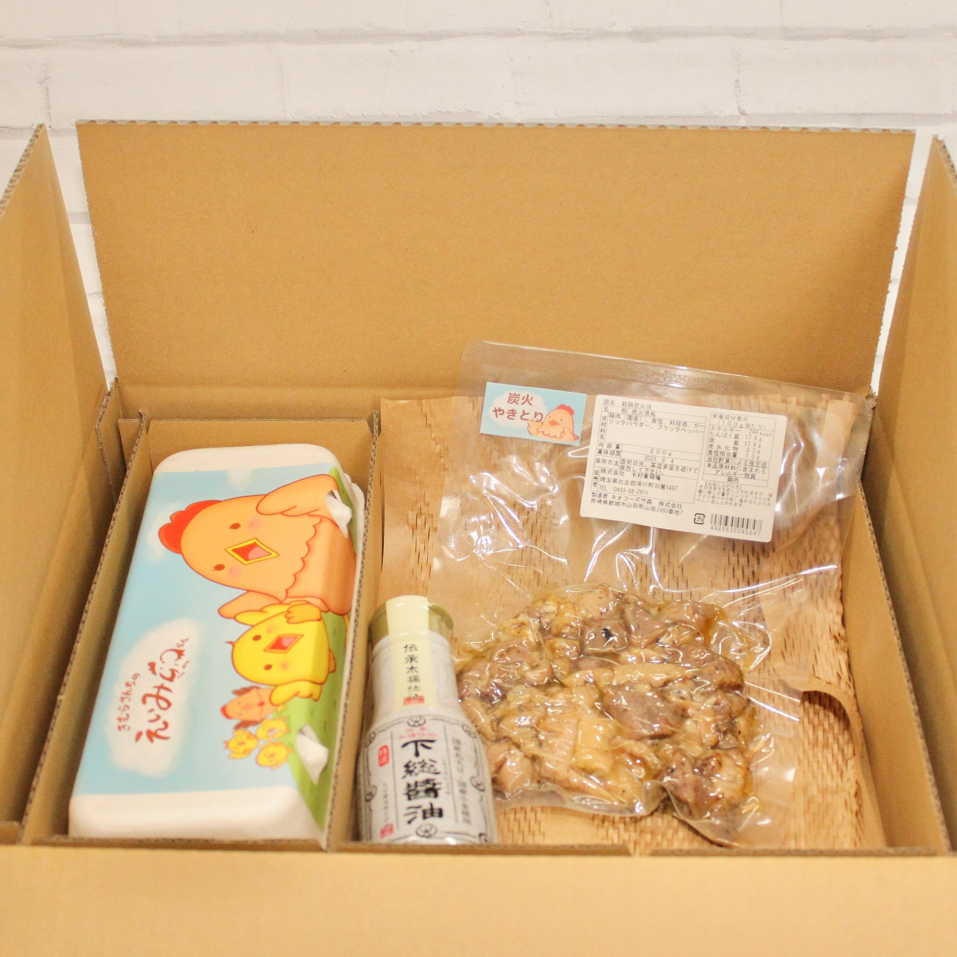 栄味卵と下総醤油と炭火焼き鳥をセットにしました。